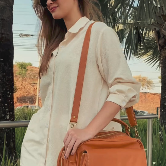 Bolsa feita em couro legítimo, versátil ,com 2 zíperes na parte superior da bolsa e bolso frontal com fechamento por 2 bottoms.